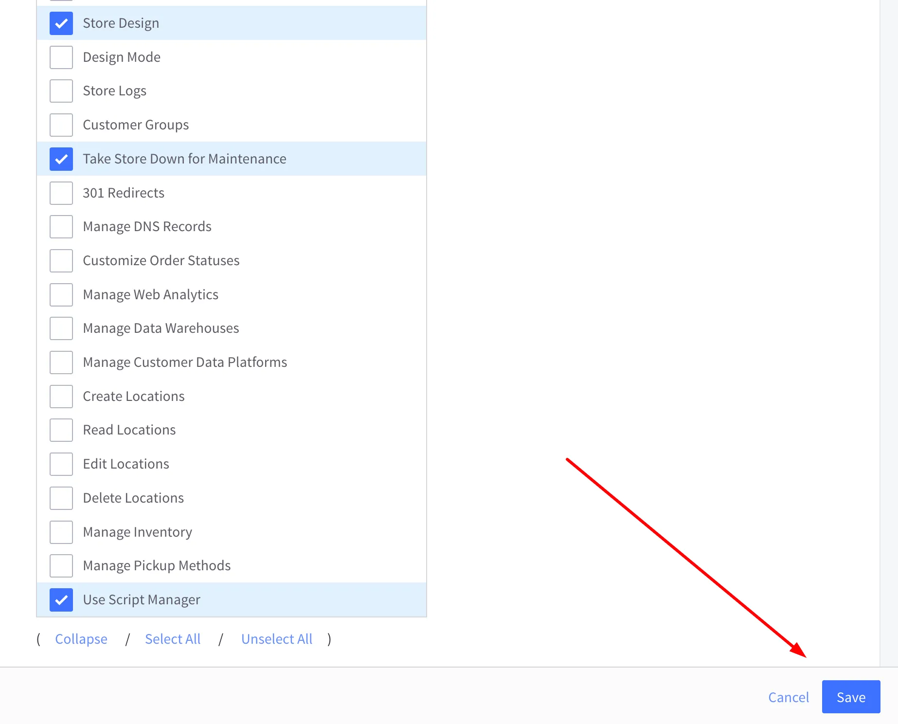 Click “Unselect All” on Sales Staff Permissions.