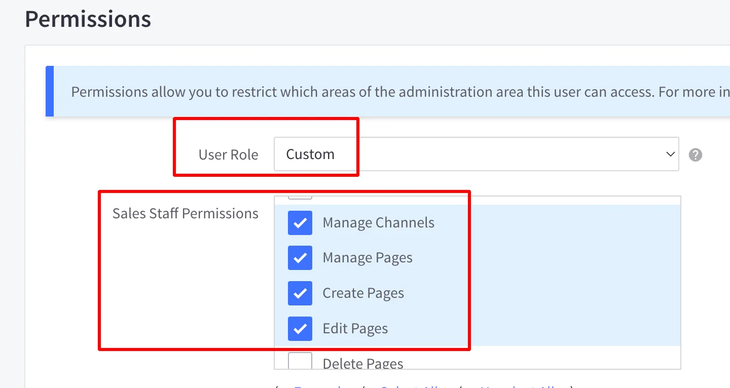 Check “Manage Channels”, “Manage Pages”, “Create Pages”, “Edit Pages” and “Use Image Manager” on Sales Staff Permissions.
