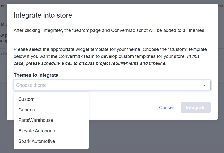 To use YMM widgets, you must select the theme with which they will be integrated. To do this, go to the “Theme Integration” page in Convermax YMM, click “Integrate,” and choose a theme from the dropdown list.