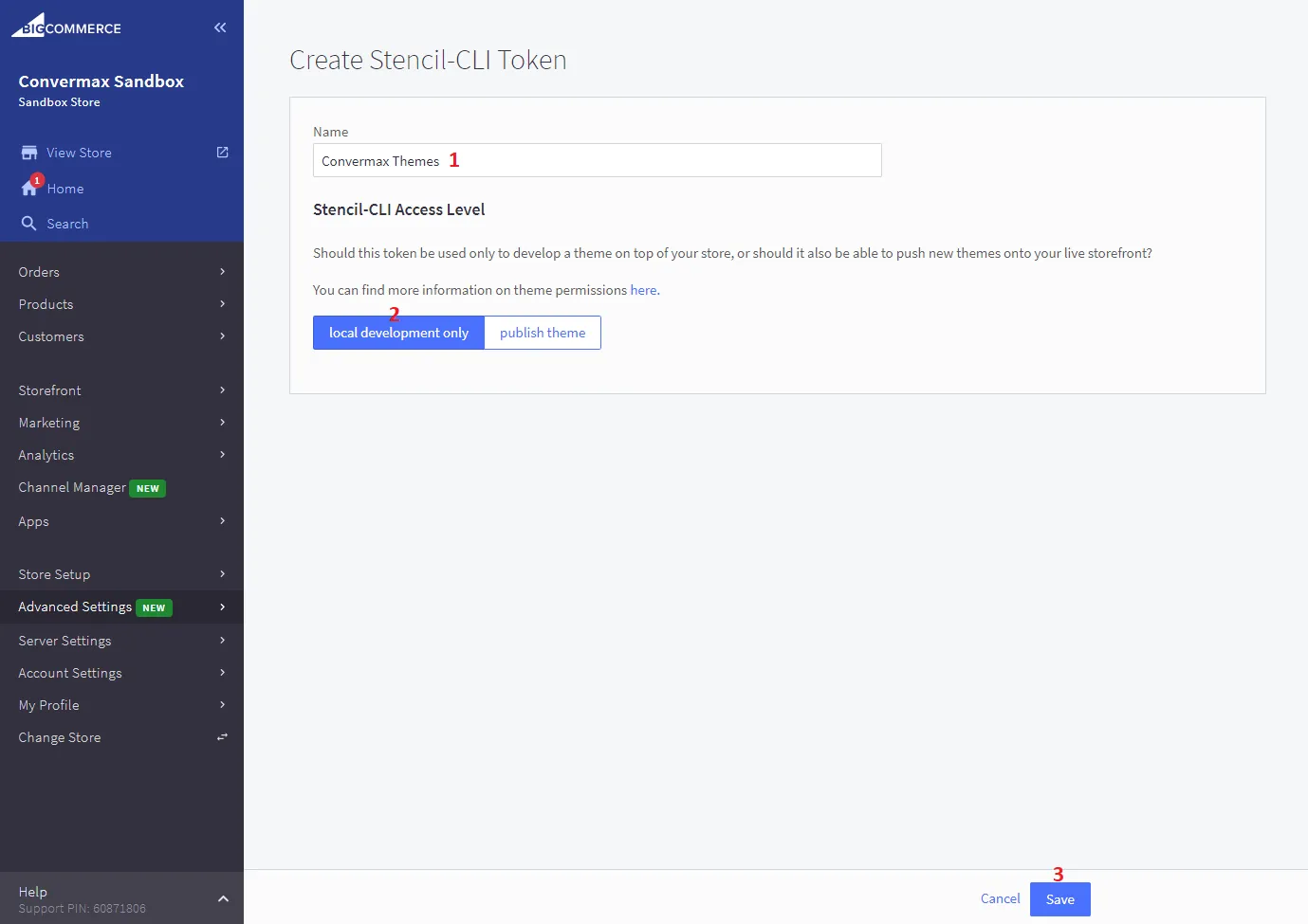 2. Enter an account name e.g. “Convermax Themes.” Select “local development only” access level and press save.