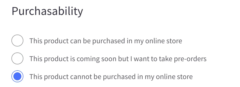 Section titled “Trivia:”- If a product’s Inventory is not tracked (Track inventory is OFF), and its Purchasability is NOT set up to “This product cannot be purchased in my online store”, then such a product won’t be “In Stock” or “Out of Stock” at all. It still can be found under the “All” option though. However, it still can be a “Special order” product. Or not. It depends on the Purchasability setting or the “Availability Text” field.