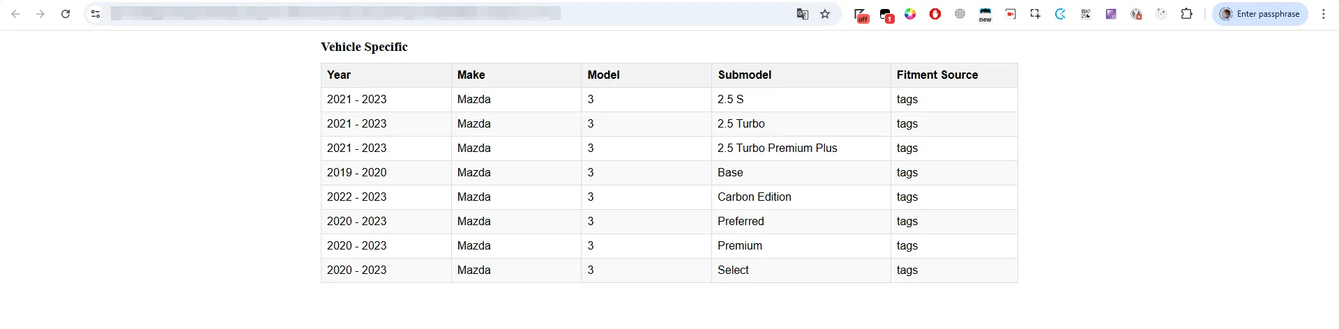 - Open the extended fitment chart with the source field indicating where each fitment is coming from: