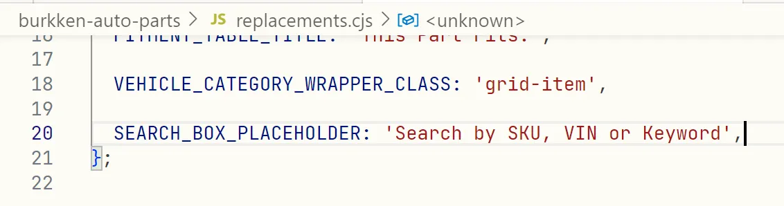 • either directly in the replacements.js file by changing SEARCH_BOX_PLACEHOLDER
