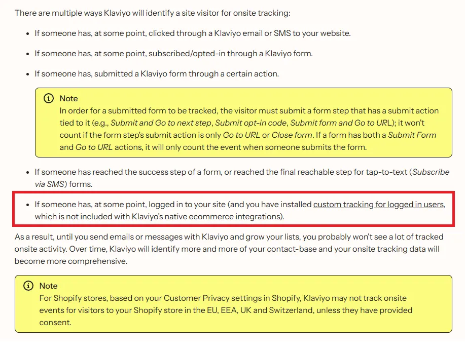 Klaviyo does not track users out of the box when they simply log into their account in the store. To track users after they have logged in, you need to implement custom logic for logged-in users