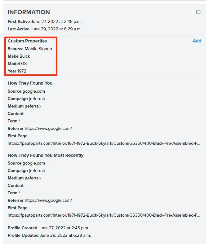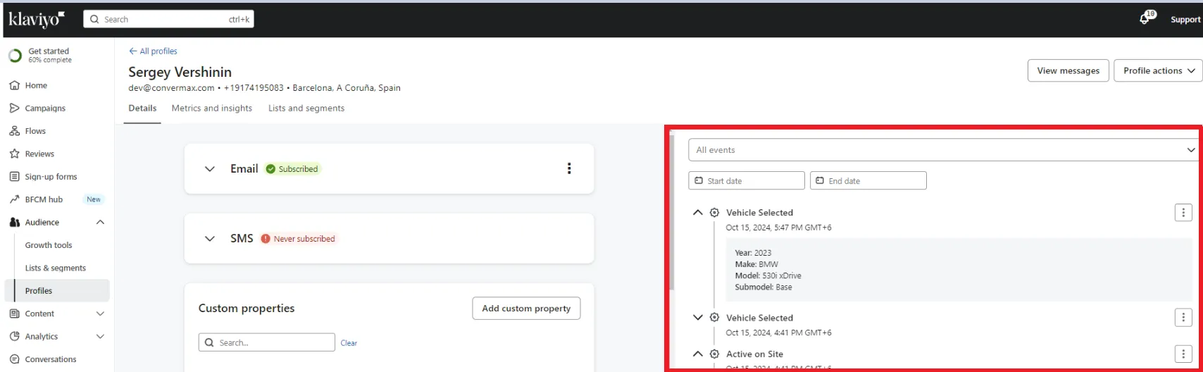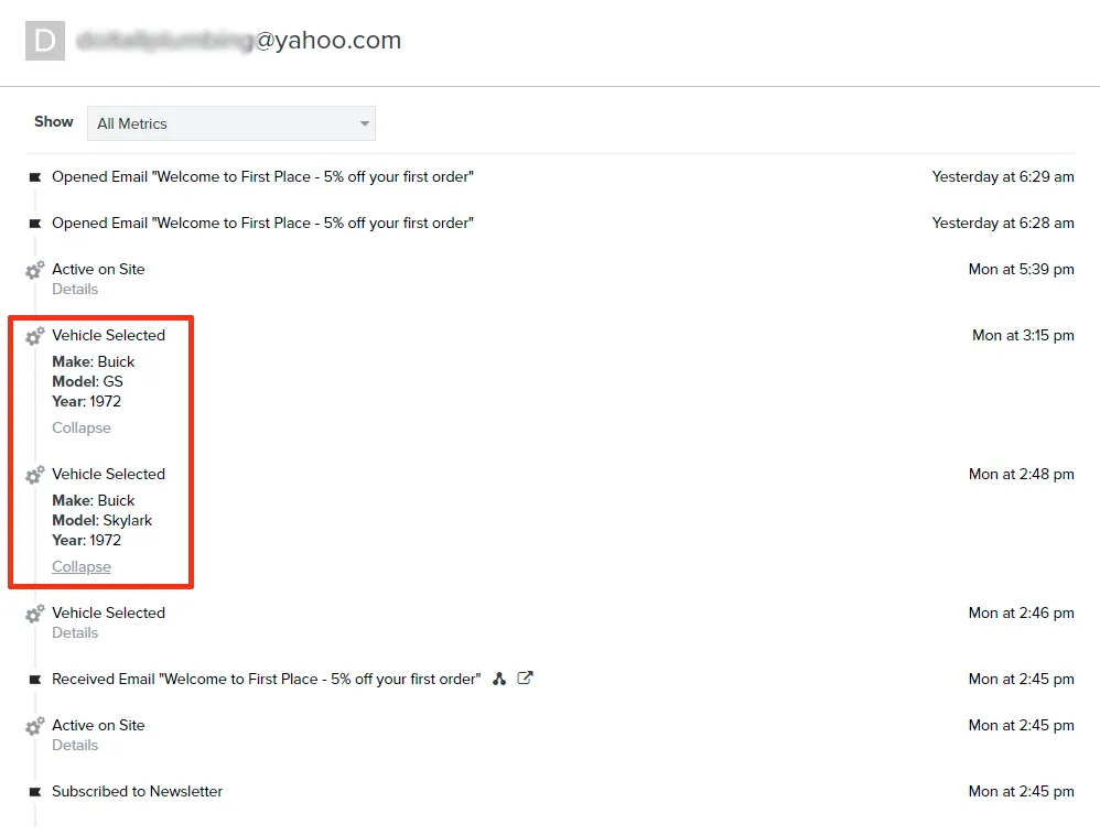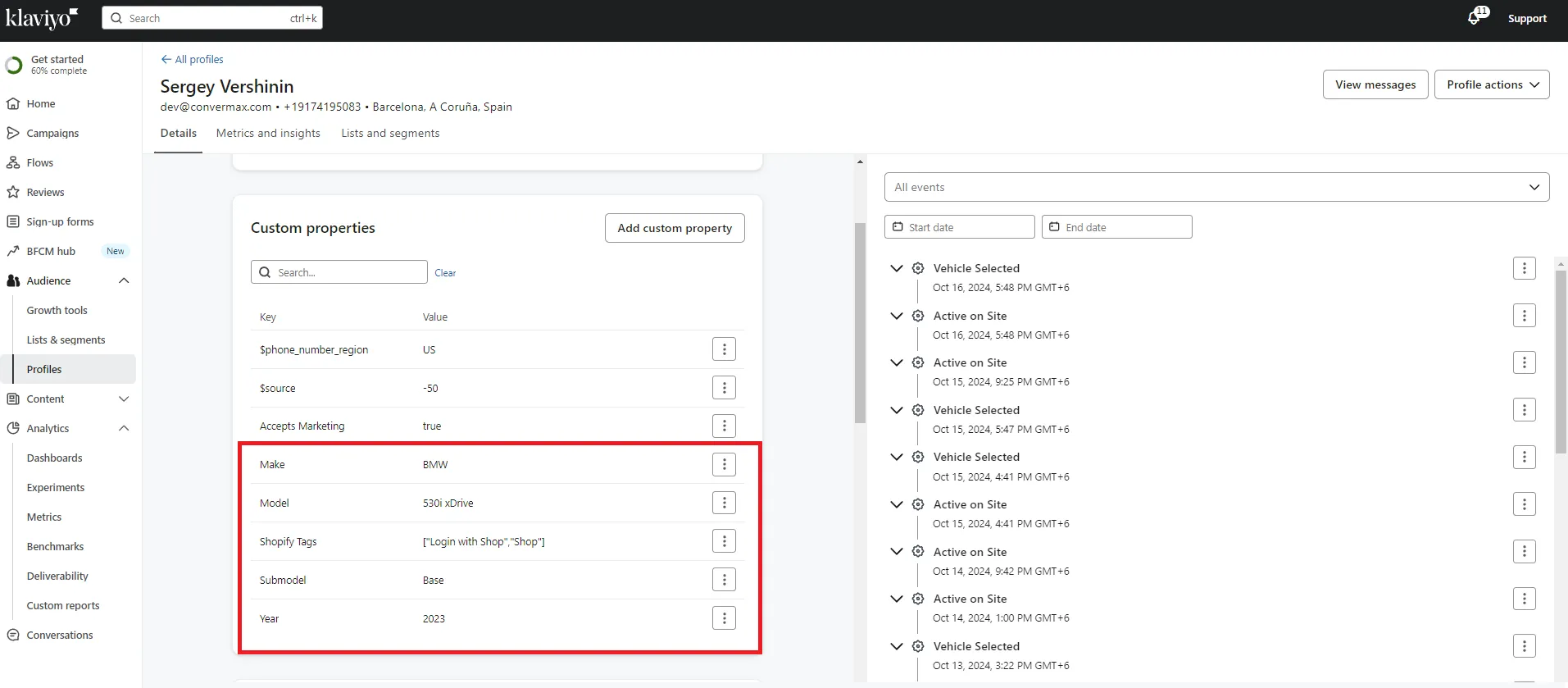 Section titled “How Klaviyo works”The user leaves their email in the pop-up to unlock an offer and continues to explore the store. While shopping for parts, website visitors often select their vehicle in the year-make-model lookup. Convermax search engine remembers the chosen vehicle and sends it to Klaviyo. So, every email saved inside Klaviyo will have information about the prospective customer’s car.