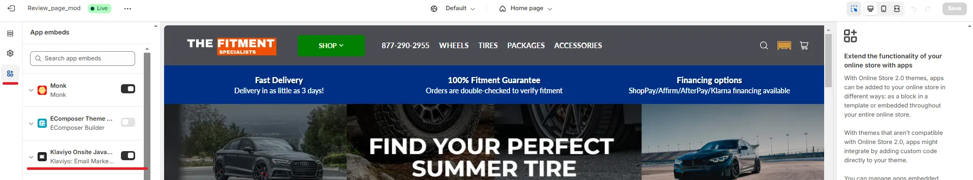 First, you need to check that Shopify has Klaviyo integration enabled. To do this, go to Themes > Customize > App embeds and make sure that Klaviyo Onsite Javascript is enabled. If it is disabled, enable it and try tracking the Active on Site event again.