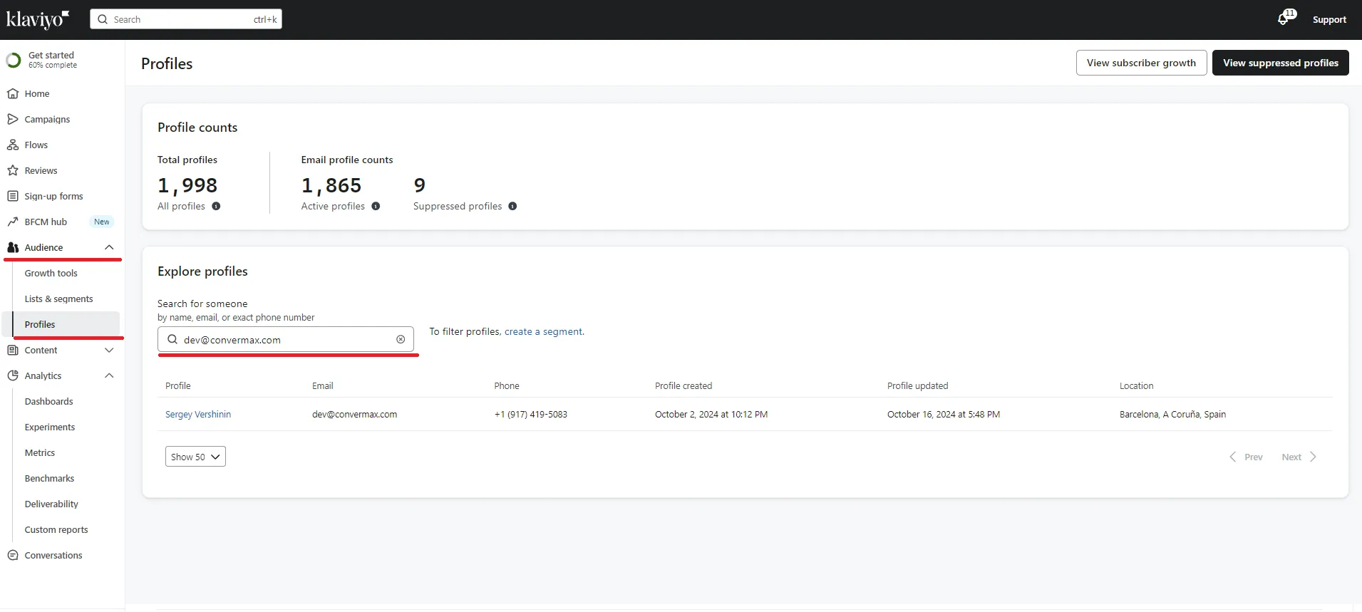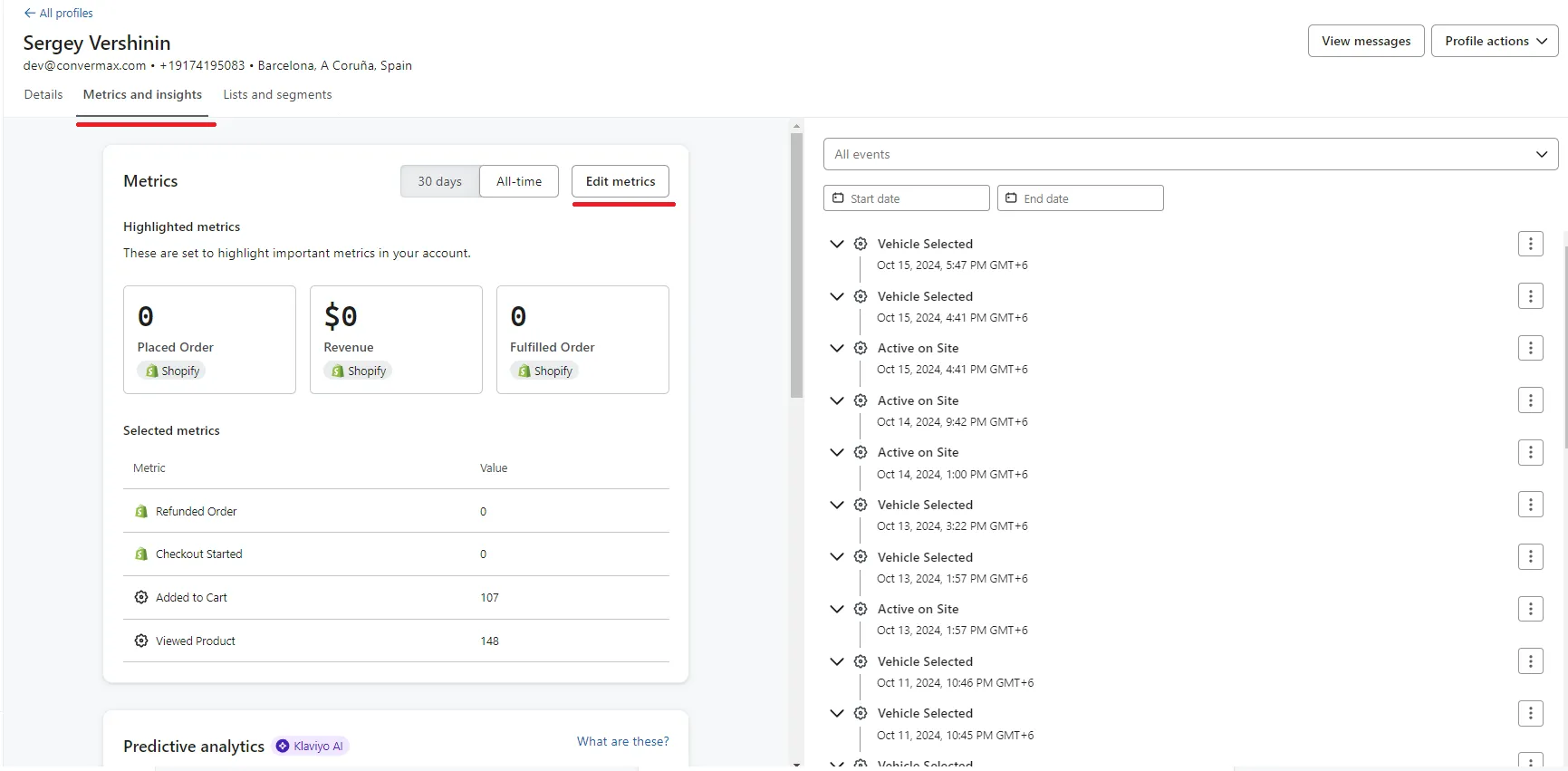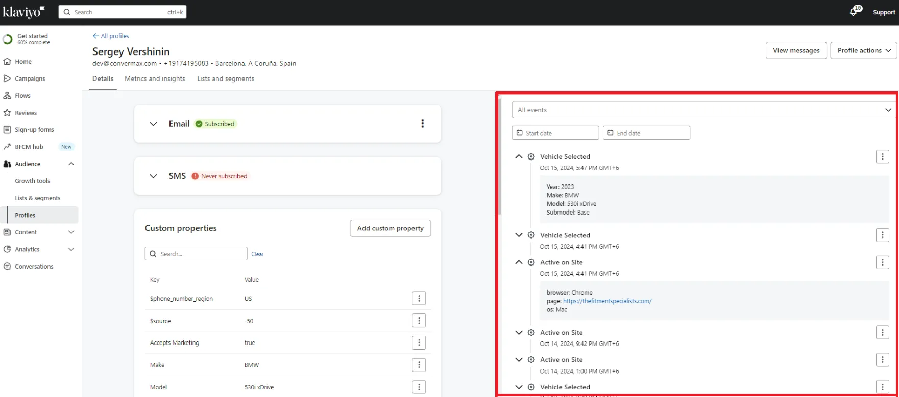 After these manipulations, refresh the page. If Klaviyo is working correctly, the Active on Site event will be emitted and then displayed on the profile page.