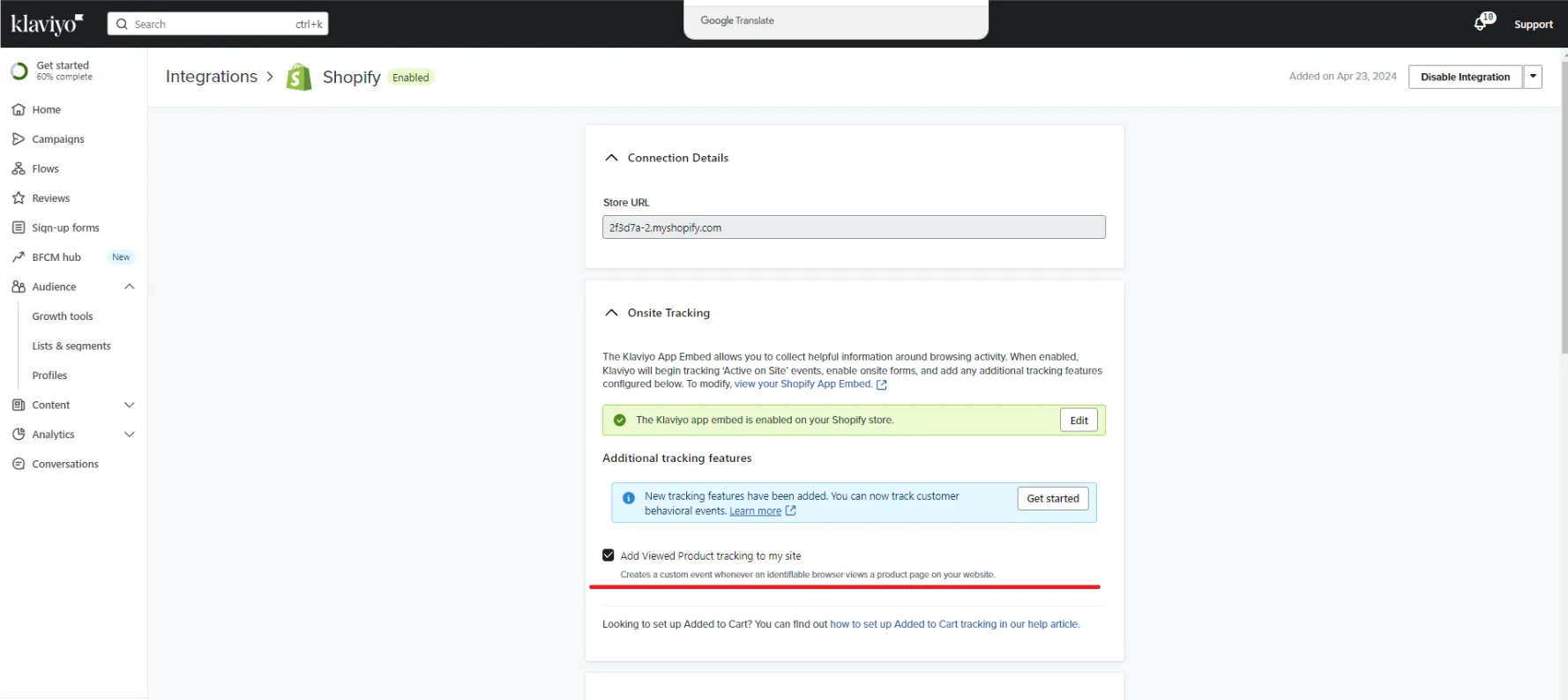 If the Active on Site event has not worked, check that the integration is enabled in the Klaviyo admin. To do this inside your store’s dashboard, go to Apps > Klaviyo: Email Marketing & SMS. You will be redirected to the Klaviyo admin dashboard to the integrations page. Then, make sure the tracking is enabled in the Onsite Tracking section.
