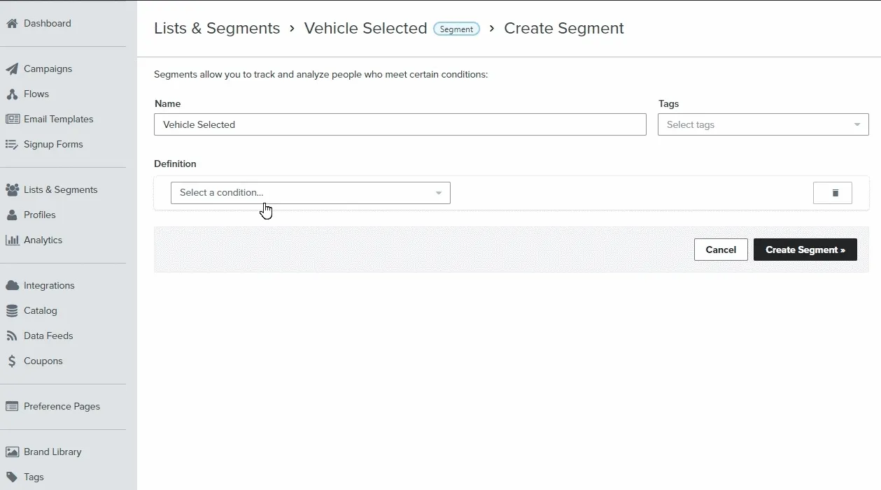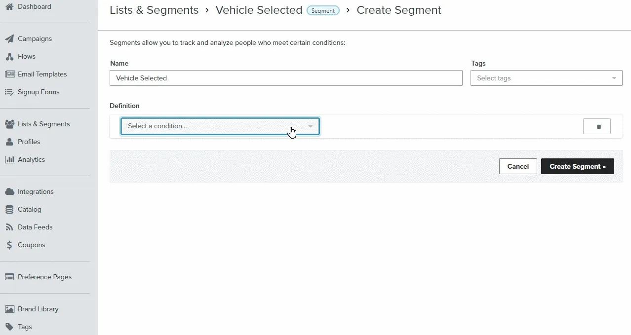 For example, it can be a segment based on the history of actions. Type “Make” or “Model” to find these values inside “Choose a property”: