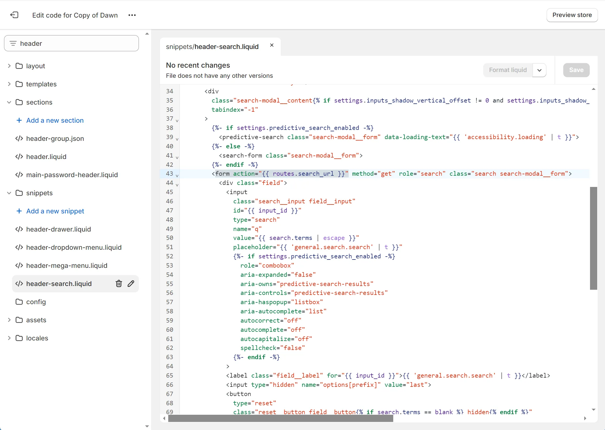formwithaction="{{ routes.search_url }}". As an example, the template of the Dawn theme is shown below: