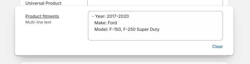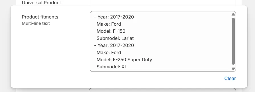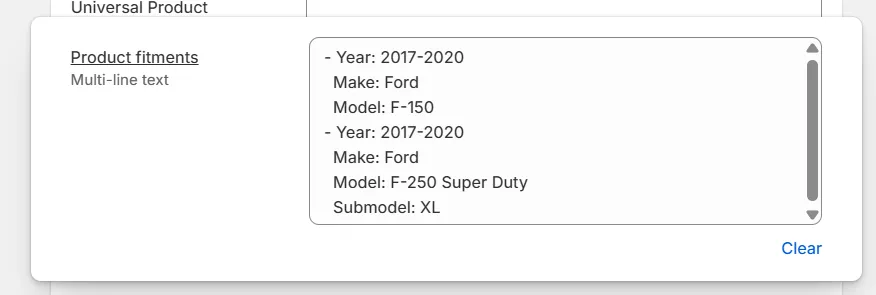 • Enter fitment data using a YAML array of objects. Start each fitment with - and indent following lines by two spaces to form a valid YAML object. For example: