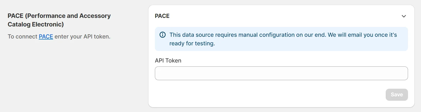 Section titled “PACE (Performance and Accessory Catalog Electronic)”You can connect your PACE account to the app, but this data source requires manual configuration on our end. We will email you once it’s ready for testing.