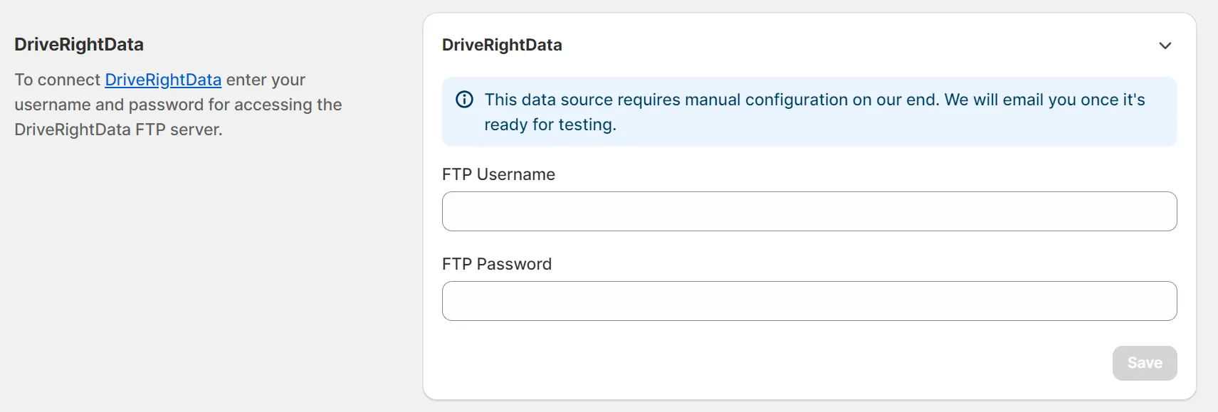 Section titled “DRD (DriveRightData)”You can connect your DriveRightData account to the Year Make Model Fitment Search app, but this data source requires manual configuration on our end. We will email you once it’s ready for testing.