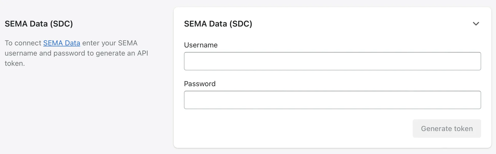 Section titled “SEMA Data (SDC)”Our app has a direct connection with SEMA Data - you just need to enter your SEMA username and password to generate an API token.
