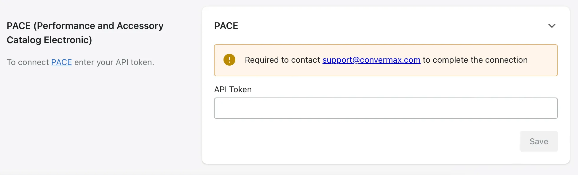 Section titled “PACE (Performance and Accessory Catalog Electronic)”You can connect your PACE account to the Year Make Model Fitment Search app, but you will need the help of one of our engineers. Please contact support@convermax.com.