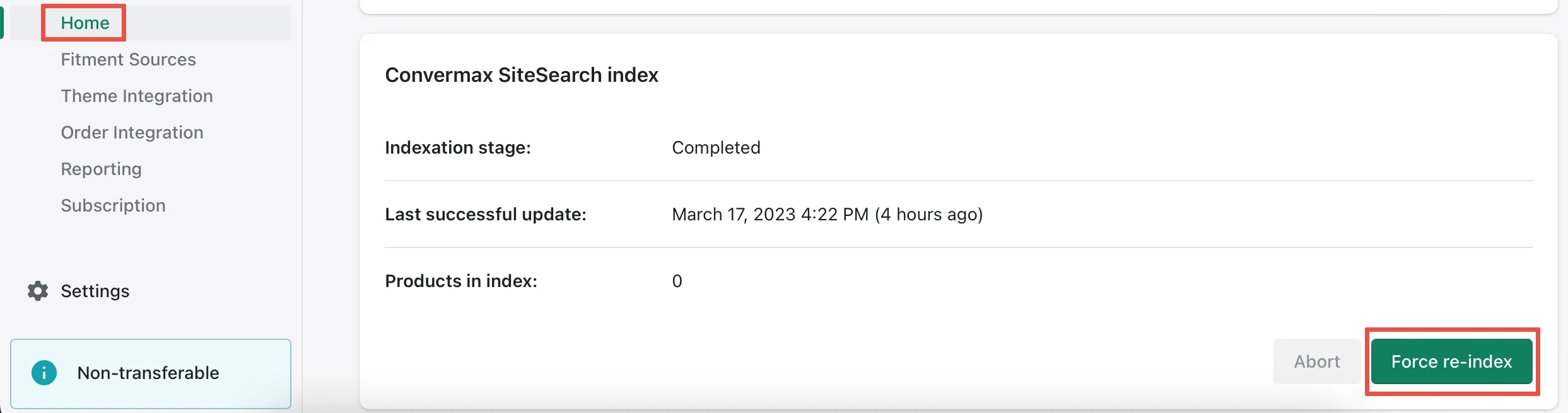 Section titled “Re-index after connecting fitment sources”❗After configuring one or all of the fitment resources, switch to the Home tab of the app, and click on the Force Re-index button. If there were any changes to the fitment data, it would refresh in the app after every new index.