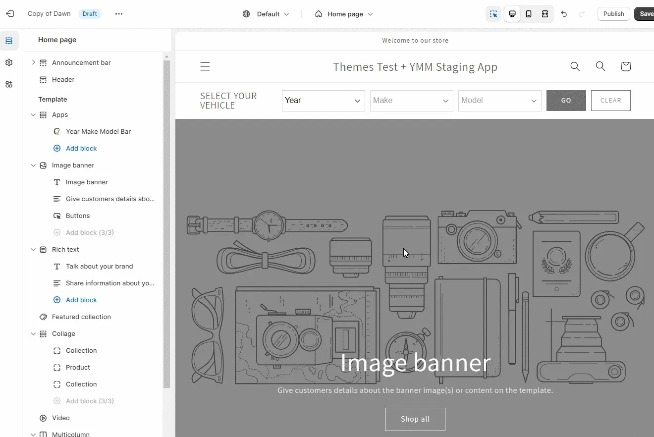 Section titled “Year-Make-Model Lookup”If you have a Shopify Online Store 2.0 theme, it is easy to implement Garage inside the Theme editor.