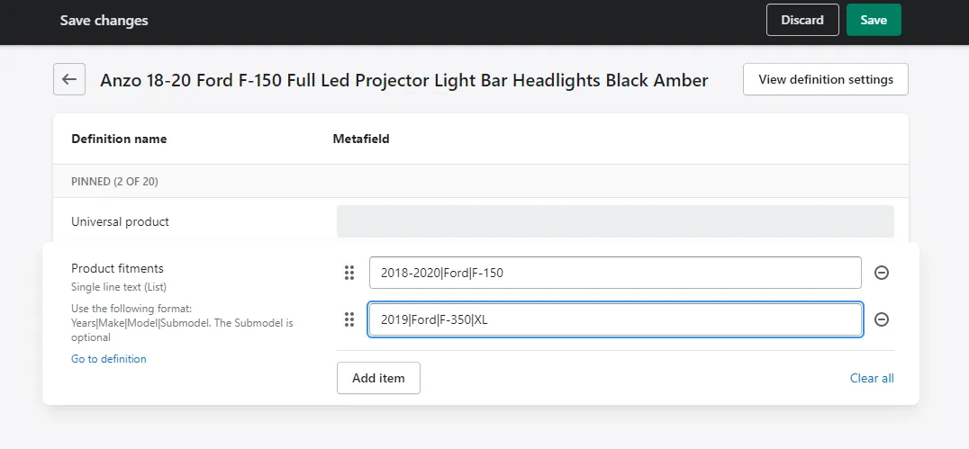 Then you can go to product metafields and assign the fitment data as shown in the example.