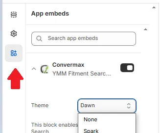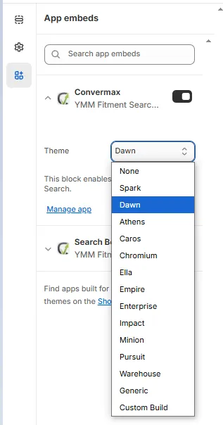 Section titled “Search Box”To make the keyword search work synchronously with the year-model-model selection, you need to replace the standard built-in search bar with Convermax. It is enabled automatically when you integrate into one of the topics in the Convermax block drop-down list, except for Generic and Custom Build. For Generic and Custom Build theme, you need to follow the instructions under point b.