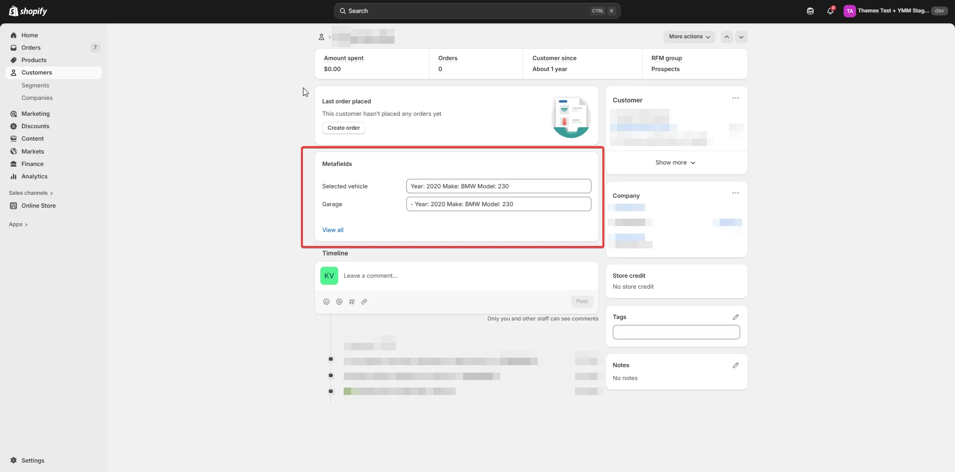 - Customer metafields – saves the selected vehicle and garage at the customer level.