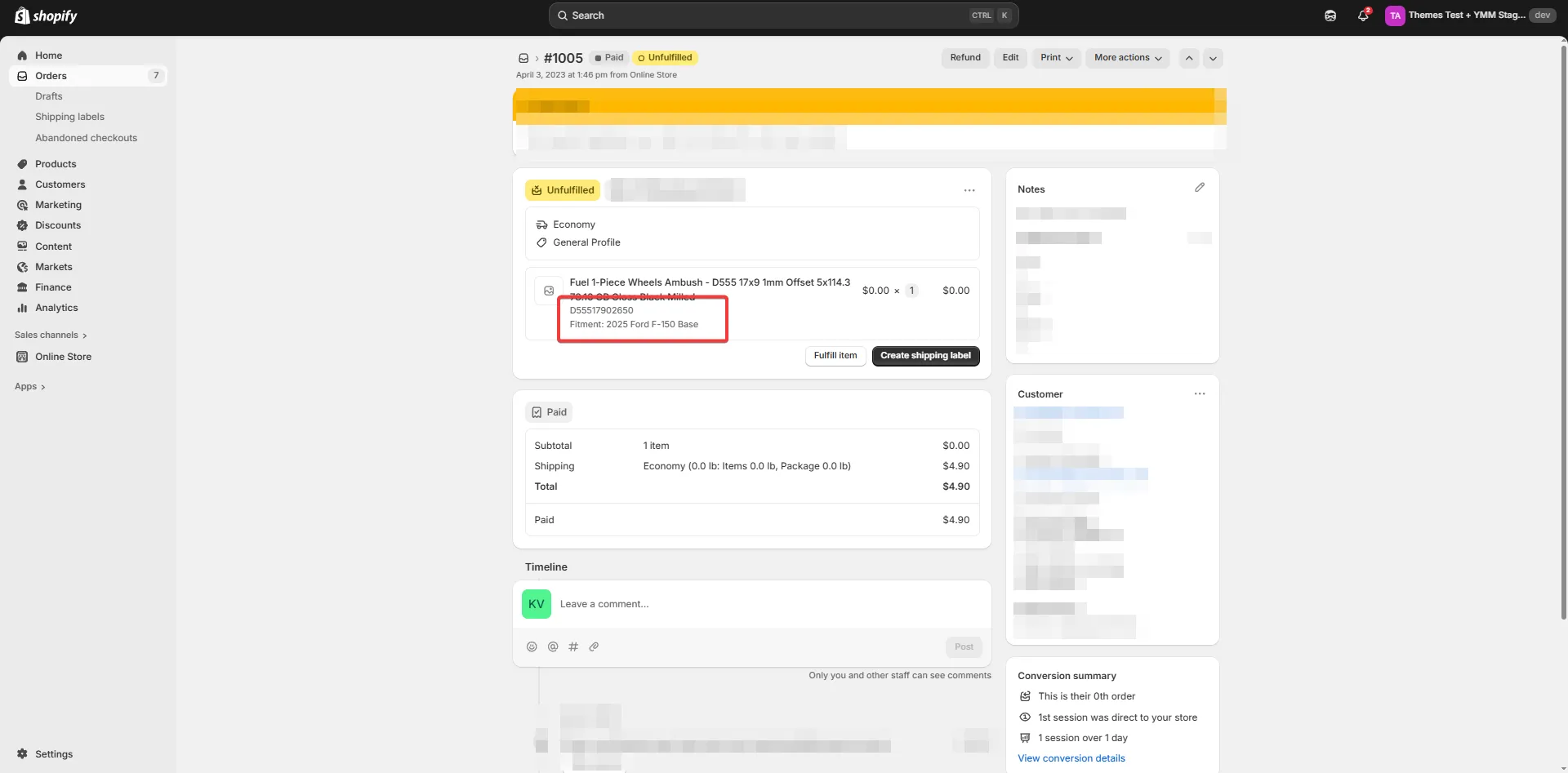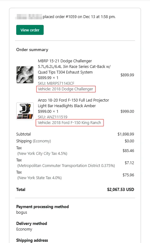 - Order line item properties – the result of fitment verification for a vehicle that was chosen when the exact line item (product) was added to cart.