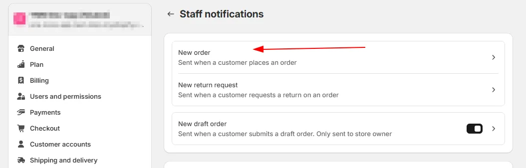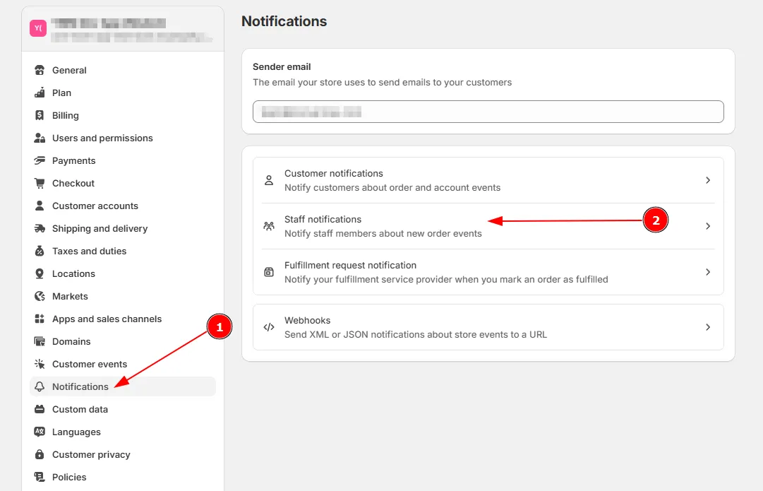 Go to Settings → Notifications → Staff notifications in the Shopify admin.